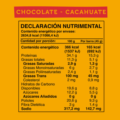 El placer del chocolate con la energía del cacahuate. Nuestra barra Chocolate Cacahuate es ideal para aquellos que buscan más que un simple snack. Con 15g de proteína, este snack te ayuda a reinventar tus días, manteniéndote en movimiento y siempre listo para el siguiente desafío.