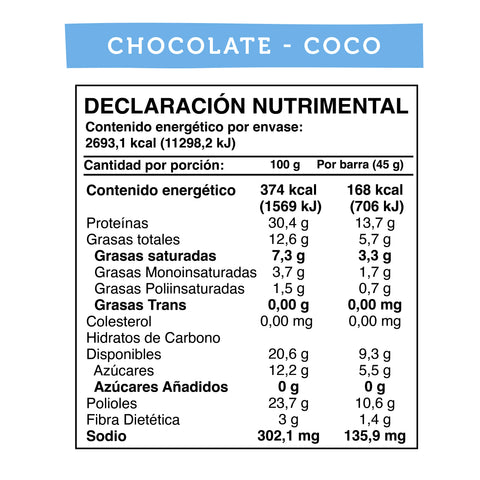 Soya inflada (aislado de proteína de soya, cacao, almidón), dátiles, maltitol (20 g/ 100 g), aislado de proteína de chícharo, sabor chocolate (cacao, maltitol (3,7 g/ 100 g), lecitina de colza, polirricinoleato de poliglicerol, extracto natural de vainilla), cacahuate molido, coco, saborizante de coco idéntico al natural.