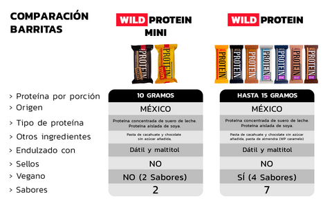 Barritas con chocolate: Wild Protein Chocolate Maní, Chocolate, Chocolate Bitter, Chocolate Coco, Chocolate Naranja, Caramelo y Mokka.